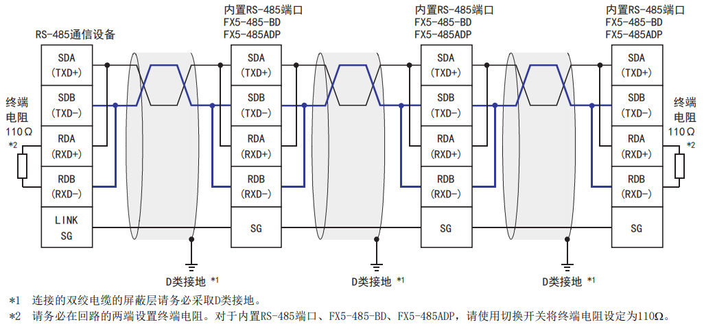 SG與SG相連,屏蔽層采取D類接地(D類接地:接地電阻100Ω以下,電器外殼接地相對電壓300V以下)。