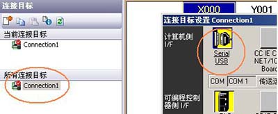 編程電纜插傳統的圓孔時,連接目標設置選擇 RS-232C,并且要選擇相應的 COM 口編程電纜插迷你 USB 口時,連接目標設置選擇 USB。
