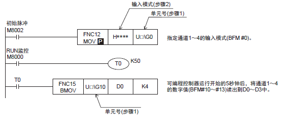 2)、將4AD中輸入的模擬量數(shù)據保存到三菱可編程控制器的數(shù)據寄存器(D0~D3)中。