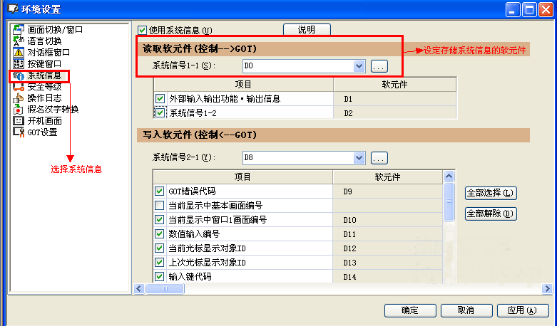 點擊菜單欄中的“公共設置”中的“GOT環境設置”選擇里面的系統信息,打開系統信息對話框,如圖所示: