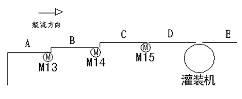 變頻器1﹑2﹑3的調(diào)速方式為兩種:1.來自灌裝機主機變頻器的模擬信號DC0~10V,經(jīng)過隔離器轉(zhuǎn)換為線性DC0~10V,再經(jīng)過電位器分壓作為變頻器1﹑2﹑3 的給定信號,以控制電機M13﹑M14﹑M15,這樣可以做到輸送帶與灌裝機的速度很好匹配;2.采用多段速控制端子SD﹑STF﹑RL﹑RM﹑RH,通過PLC編程,由PLC發(fā)出控制信號以控制速度。PLC根據(jù)灌裝機操作臺發(fā)出的信號來判斷使用那種速度控制方式,又根據(jù)瓶流情況選擇高低速。在模擬信號控制時是通過輔助繼電器KA1和KA2,KA3和KA4,KA5和KA6的組合,經(jīng)W1﹑W2,W3﹑W4,W5﹑W6分壓控制變頻器輸出速度。在多段速時通過PLC的輸出Y10﹑Y11﹑Y12﹑Y13,Y20﹑Y21﹑Y22﹑Y23,Y24﹑Y25﹑Y26﹑Y27分別調(diào)節(jié)各個變頻器的輸出頻率以達到多段輸送帶的速度匹配及與灌裝機的速度匹配。在模擬控制方式調(diào)整中,電位器分壓比的調(diào)整是個關(guān)鍵,通過生產(chǎn)調(diào)試中摸索,終于找到了比較好的速度匹配。分壓比一旦調(diào)好,不得隨意改動。