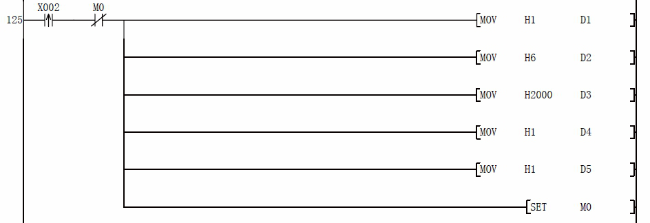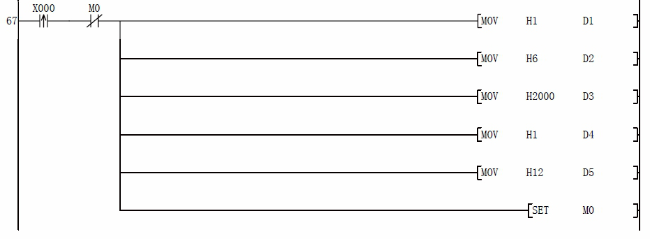 D5:寫頻率寄存器數(shù)據(jù),先給 D0 預寫想要的頻率值后,然后按下 X3 即可把預想的頻率寫入變頻器,比如預想寫如 21.22HZ 的話,那么應該首先給 D0 賦值 K2122,然后按下 X3 即可寫入頻率