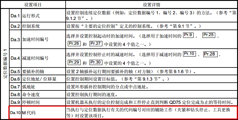 二:在定位數據的設置項目Da.10 “M 代碼”中設置M代碼編號(1-65535可以設置)