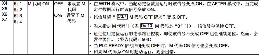 當M代碼ON 信號(X4、X5、X6、X7)為ON 時,必須通過順控程序使它變成OFF。為了使M代碼ON 信號變成OFF,在“ Cd.7 M 代碼OFF 請求”中設置“1”。