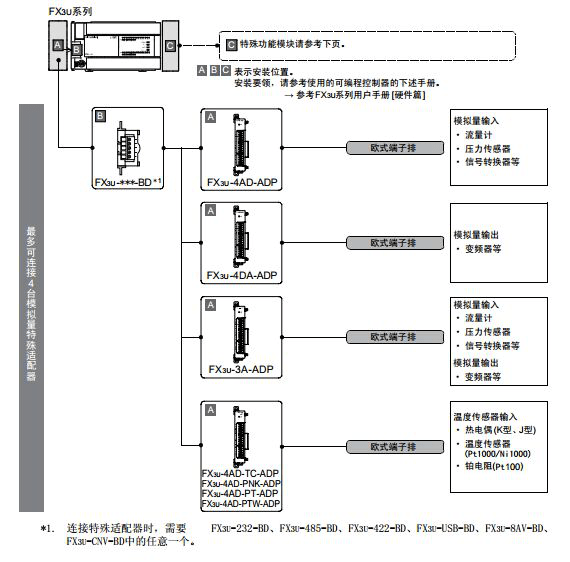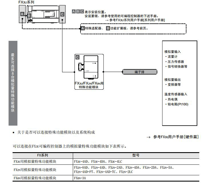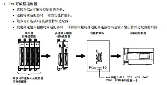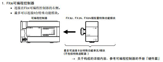下面的圖片是小編從三菱FX3U系列PLC用戶手冊(硬件篇)上截下來的,都是一些關(guān)于三菱FX3U系列PLC連接三菱PLC擴展模塊的說明以及方法!
